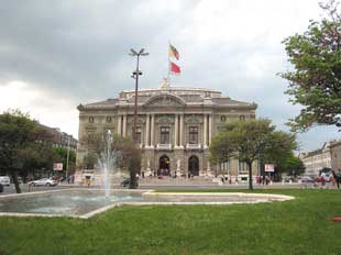 | まずは大劇場。 タクシー運転手に「オペラハウス」と言ってみましたが、これはダメ。 「グランテアター」が正解。 グランテアター前の広場にデュフール将軍の騎馬像が建っていました。 デュフール将軍はデュナンと共に赤十字の設立に貢献のあった人物だそうです。
