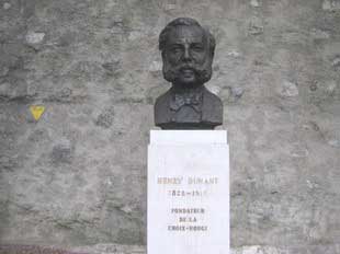 | グランテアター前の広場の左手にトレイユ坂があり、その登り口にアンリ・デュナンの胸像が建っています。 アンリ・デュナン(1828年5月8日〜1910年10月30日)はジュネーブに生まれ、赤十字を創設し、1901年に第一回ノーベル平和賞を受賞したことで知られています。