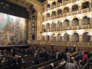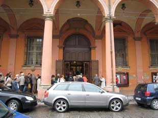 | さて、夜は当然オペラです。 ボローニャ歌劇場は1998年以来、何回も来日公演をしており、日本でも馴染みの深いオペラハウスです。 しかし、現地ボローニャの歌劇場(テアトロ・コムナーレ)は客席が少なく、定期会員だけでチケットが売り切れてしまうため、日本のオペラファンの間ではチケットの取りにくいオペラハウスとして知られています。 当日券狙いの日本人に会いましたが、朝には天井桟敷しか残っていなかったそうです。 今回チケットが確保できたことは、JALワールドプレイガイドに感謝しています。 料金が高すぎるけれどね (^_^; 。