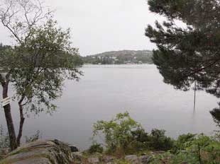 先の団体が行った道を行きますと、橋を渡ります。 橋の上から眺めると、左の緑の草屋根がコンサートホール。 中央に湖に面して赤い作曲小屋。 コンサートホールの前にグリーグ像が立っていますが、分かりますか? 橋を渡ってなおも行くと、グリーグの家が見えてきます。