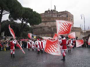テヴェレ川に沿って歩き、いよいよサンタンジェロ橋を渡ります。 サンタンジェロ橋は大変に混雑していました。 サンタンジェロ城は正月で閉まっていましたが、広場では正月らしいパフォーマンスが行われていました。