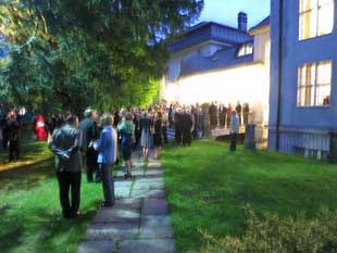 | 休憩時間になり、さっそくビュッフェに向かいます。 ビュッフェは飲み物を飲みながら語らい合う人々で混雑していました。 その間をすり抜けて中庭に出ると、奥に長年探してきた『魔笛の家』がありました。 この家を見るためにどれほど苦労したことか。 「落ち穂拾いの旅」をした甲斐もあるというものです。