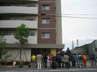 2005年4月25日(金)午前9時20分ころ、兵庫県尼崎市のJR福知山線塚口→尼崎間のカーブで、快速電車がスピードの出しすぎで、近くのマンションに突っ込む事故が起き、死者107人、負傷者500人を超える大惨事となりました。 現場までは尼崎駅から徒歩10〜15分くらい。 マンション「エフュージョン尼崎」の前には、多くの報道陣がたむろしていました。 翌日の新聞によれば、マンション住民が遺品の捜索をした取材があったようです。 「エフュージョン尼崎」は、思ったより新しい建物でした。